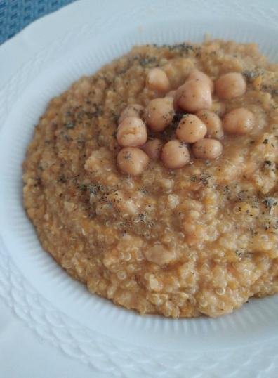 Metti in ammollo i ceci secchi in acqua per una notte intera. Trascorso il tempo necessario per far rinvenire i ceci, sciacqua sotto acqua corrente per qualche minuto. In una pentola capiente metti abbondante acqua, aggiungi i ceci e lascia cuocere per un paio d’ore. Se hai i ceci in scatola vanno benissimo, sciacqua per bene dal liquido di conservazione. Trascorse le due ore di cottura frulla i ¾ (mettete da parte pochi ceci che userete come decorazione), e aggiungi la vellutata di zucca. Intanto, cuocete la quinoa in abbondante acqua salata, scola e aggiungi alla crema di ceci e zucca. Infine aromatizza con una spolverata di salvia e guarnisci con pochi ceci come topping.
